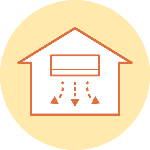 「ファースの家」は、天井裏に設置したエアコンがメインとなり、家全体の冷暖房を行います。高気密高断熱の構造でしっかり守られた建物の壁内に設けた通気層を通り抜ける空気の流れをつくることによって、快適※な温熱環境をつくり、少ないエネルギーをムダなく効率的に使える、コストパフォーマンスに優れたシステムです。
