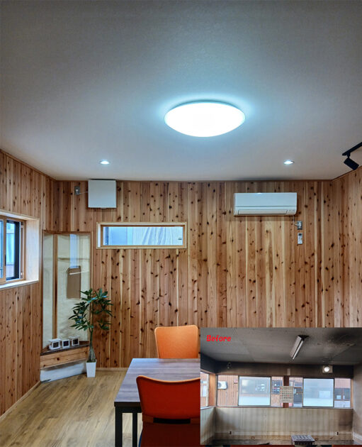 休憩室をお客様相談室へリフォーム。壁は杉板貼で、明るい感じに仕上げました。奥には、高気密住宅の構造もご覧いただけるようにしました。